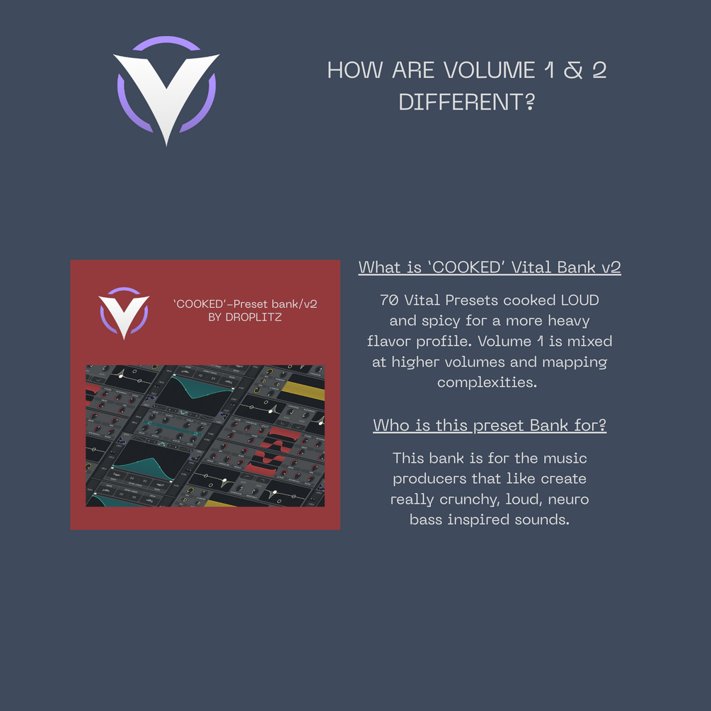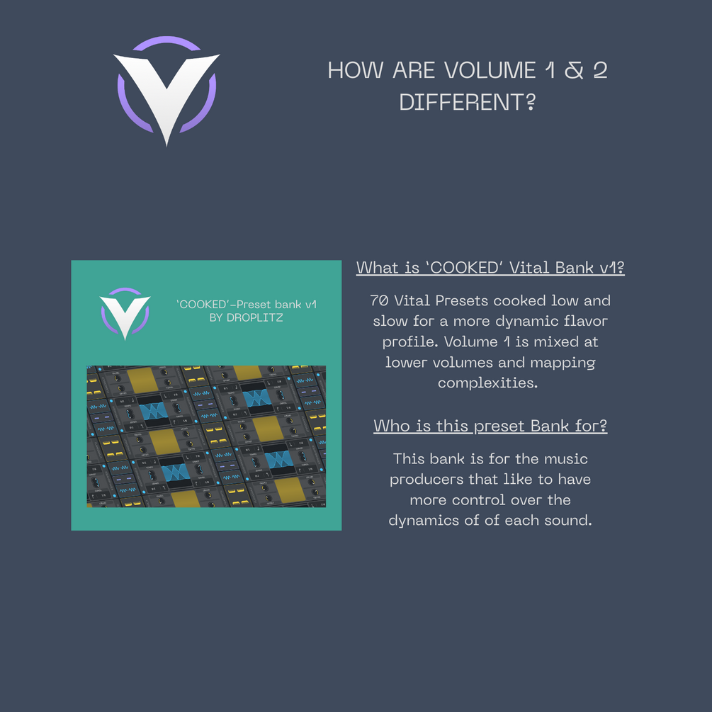70 of the same presets in each vital bank, however they differ in flavors and were created with a different end goal in mind. How much heat do you want? With the use of a OTT in v1. verse a clipper in v2. are what give each pack their final sound.